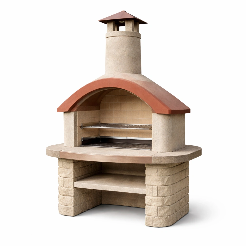 Parrilla construida con cemento reforzado y ladrillo refractario ideal para uso exterior. Ofrece un excelente rendimiento térmico.